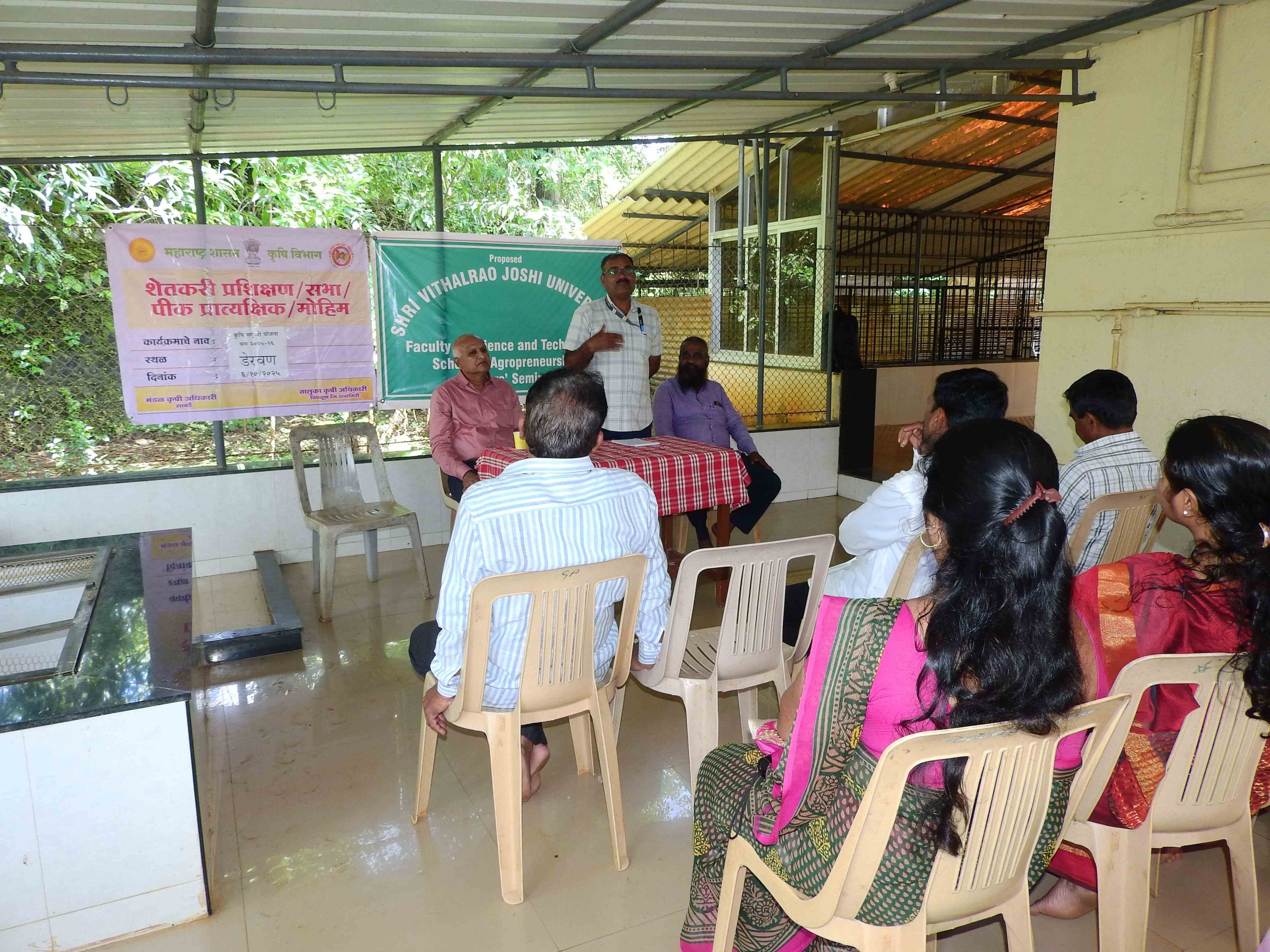 On October 6, 2025, the SVJCT Agropreneurship Program organized a Farmer’s Group Meeting beside the paddy fields at its premises. Farmers from the area, including both men and women, actively participated. Shri Hasbnis guided the farmers on practical agricultural techniques, while Shri Jadhav (Sub-Agricultural Officer) and Mrs. Shivani Naik (Agricultural Assistant) from the Department of Agriculture, Government of Maharashtra, shared information on various government schemes and subsidies.