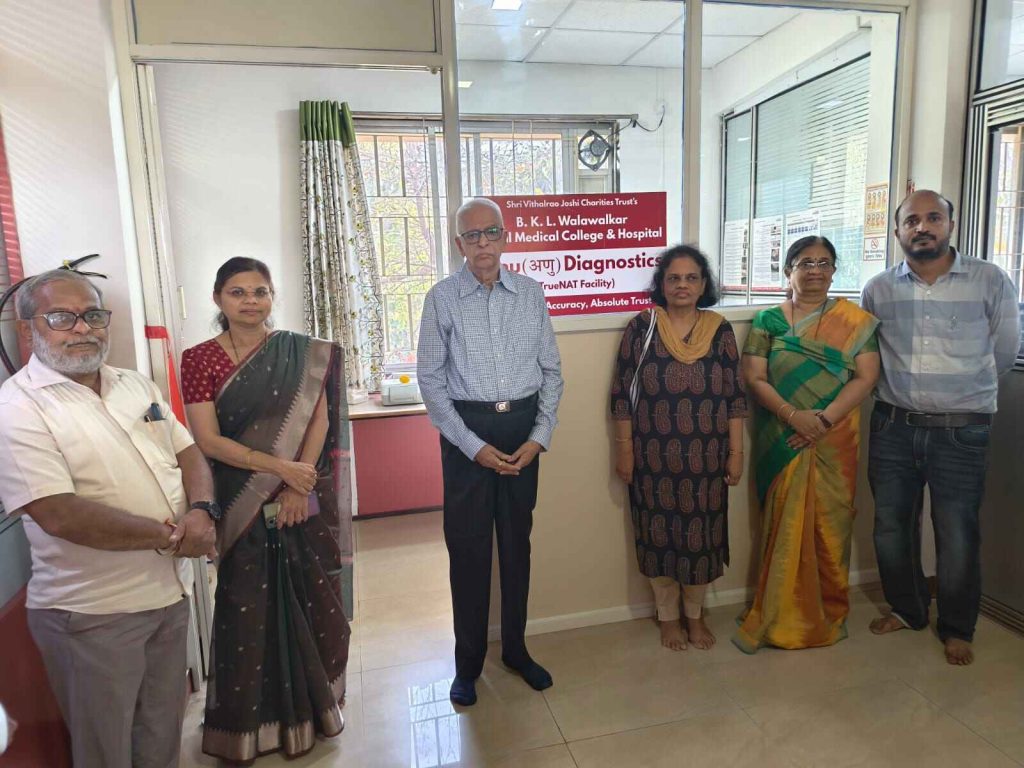 The state-of-the-art TrueNAT diagnostic facility under Anu Diagnostics was inaugurated with great enthusiasm at B.K.L. Walawalkar Rural Medical College & Hospital, Dervan. The inauguration ceremony was graced by the institution’s प्रेरणास्थान (inspiration) and mentor, Shri Kaka Maharaj. Guided by the motto “Health for All, Women Empowerment, and Upliftment of the Poor and Needy,” and with the support of Founder Chairman Shri Vikas Walawalkar, this advanced facility has been established under the Department of Microbiology in the Vishnu (Virology) Research and Diagnostic Laboratory (VRDL). The initiative has been implemented under the able leadership of Medical Superintendent Dr. Suvarna Patil and Dr. Netaji Patil, with the aim of strengthening diagnostic services and improving patient care. This advanced TrueNAT facility will significantly contribute to the National Tuberculosis Elimination Program (NTEP) by enabling faster and more accurate diagnosis. The machine makes it possible to conduct 44 new diagnostic tests at affordable costs with a much quicker turnaround time. Previously, many of these tests required samples to be sent to Mumbai, which resulted in higher expenses and delays of five to seven days in receiving reports. With the introduction of this facility, reports will now be available locally within a few hours, ensuring timely diagnosis and treatment. In recent months, the unavailability of CBNAAT cartridges in the region had posed serious challenges in tuberculosis detection; however, the TrueNAT system now offers a reliable and efficient alternative. It allows rapid detection of tuberculosis along with identification of Rifampicin resistance, thereby helping doctors make better and more informed treatment decisions. On this occasion, Shri Kaka Maharaj guided the gathering with his inspiring words, stating, “Work tirelessly for patient welfare. The reputation of the institution grows through dedicated service. Serving patients is true service to God.” Medical Superintendent Dr. Suvarna Patil emphasized that the staff and doctors of the VRDL department should continue to work with the same sincerity, dedication, and teamwork that they demonstrated during the COVID-19 pandemic. Dean Dr. Manasingrao Ghatge also highlighted the importance of ensuring that the maximum benefit of this advanced facility reaches patients and urged all doctors to utilize it effectively for better healthcare outcomes. The event was attended by several distinguished dignitaries including Shri Shripati Walawalkar, Dr. Anand Joshi, Dr. Anil Kurane, Dr. Anagha Modak, Dr. Deshpande, Dr. Neelam Shirsath, Dr. Janjurwad, Dr. Amey Paranjpe, Dr. Vinod Shinde, Dr. Prashant Maulya, Dr. Manish Badoni, and Shri Swapnil Kshirsagar. Members of the Department of Microbiology, including Mrs. Sanika Phadnis, Ms. Swaragi Nimbalkar, Dr. Ashlesha, Dr. Vibhuti, Dr. Israr, Dr. Shreyas, Dr. Shivraj, Dr. Aniruddha, Ms. Shrutika, Ms. Samartha, Makarand, Ms. Akshata, Ms. Anuja, Siddhant, and other staff, were also present on the occasion. The program concluded with a vote of thanks delivered on behalf of the Department of Microbiology by Dr. Ramtirthkar and Dr. Yogendra Shelke.
