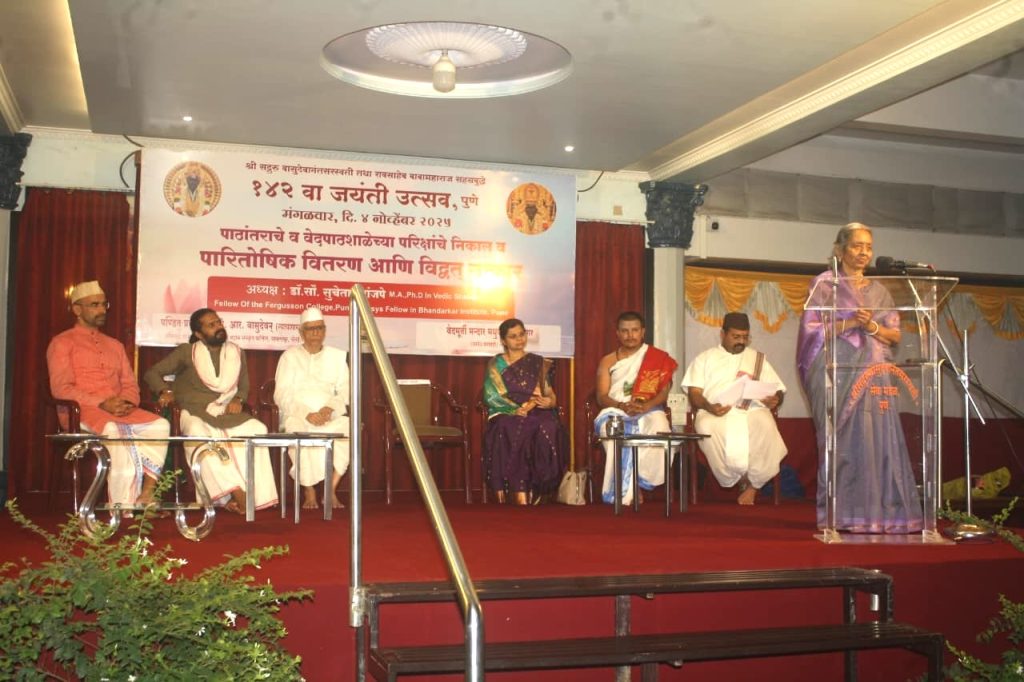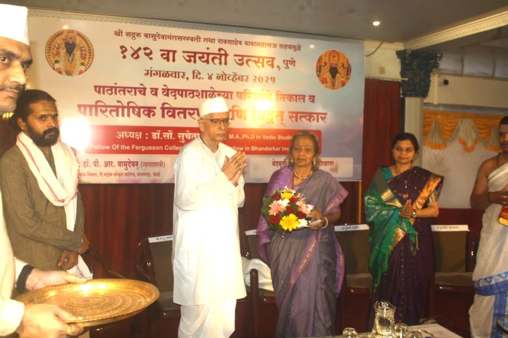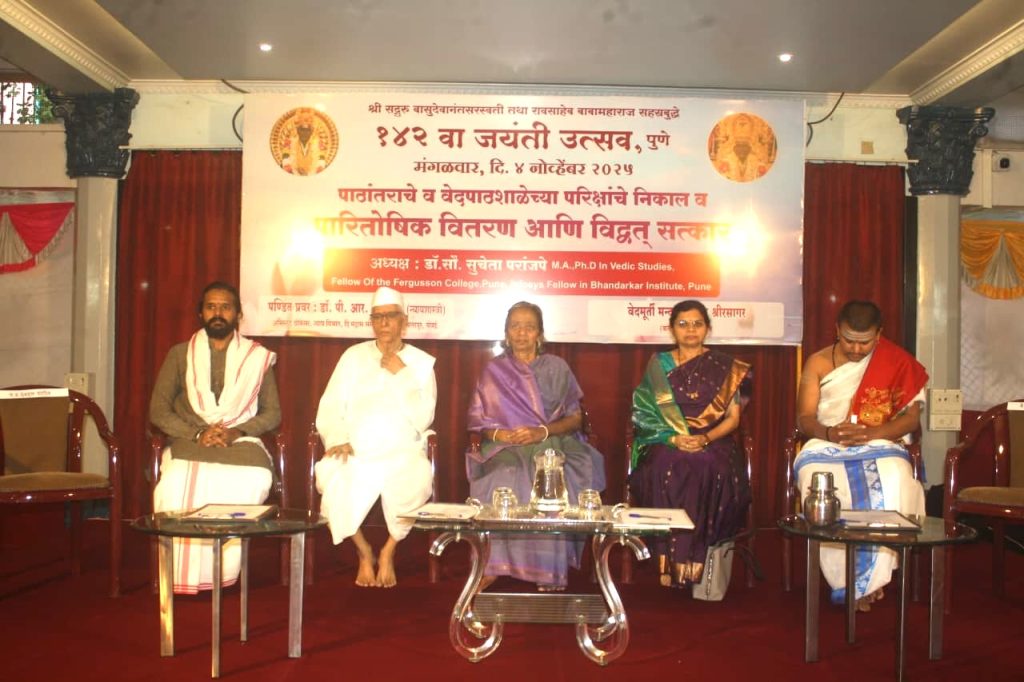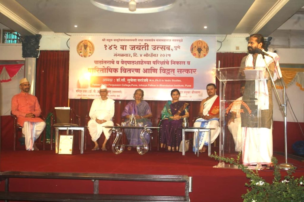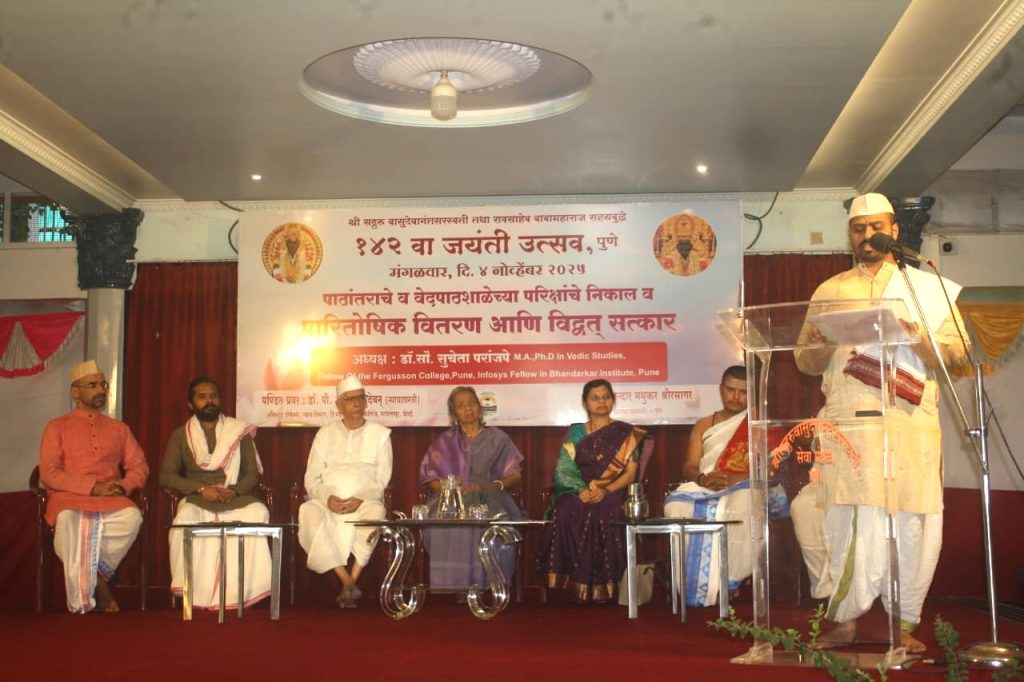 On 04 November 2025, a special prize distribution and scholarly felicitation ceremony was organized to mark the Jayanti of Parampoojya Vasudevanand Saraswati (Tembe Swami). The event celebrated the achievements of students who participated in various competitions and Vedic examinations held in his honor.